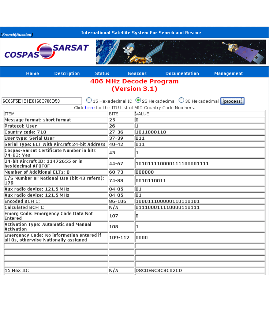 Input the 22-digit hex code into the 406 MHz Decode Program provided. See below: